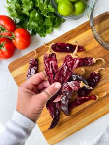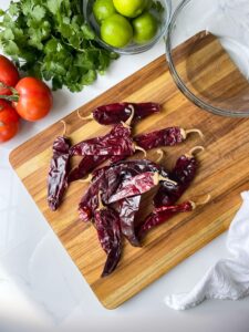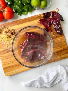 Once you have removed the stems, seeds and any membrane you want to remove, submerge the dried chili peppers in hot liquid until they are plump and softened. This usually takes about 30 minutes.