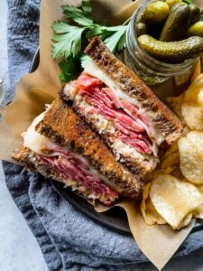 - Slice the reuben in half and serve with chips and pickles