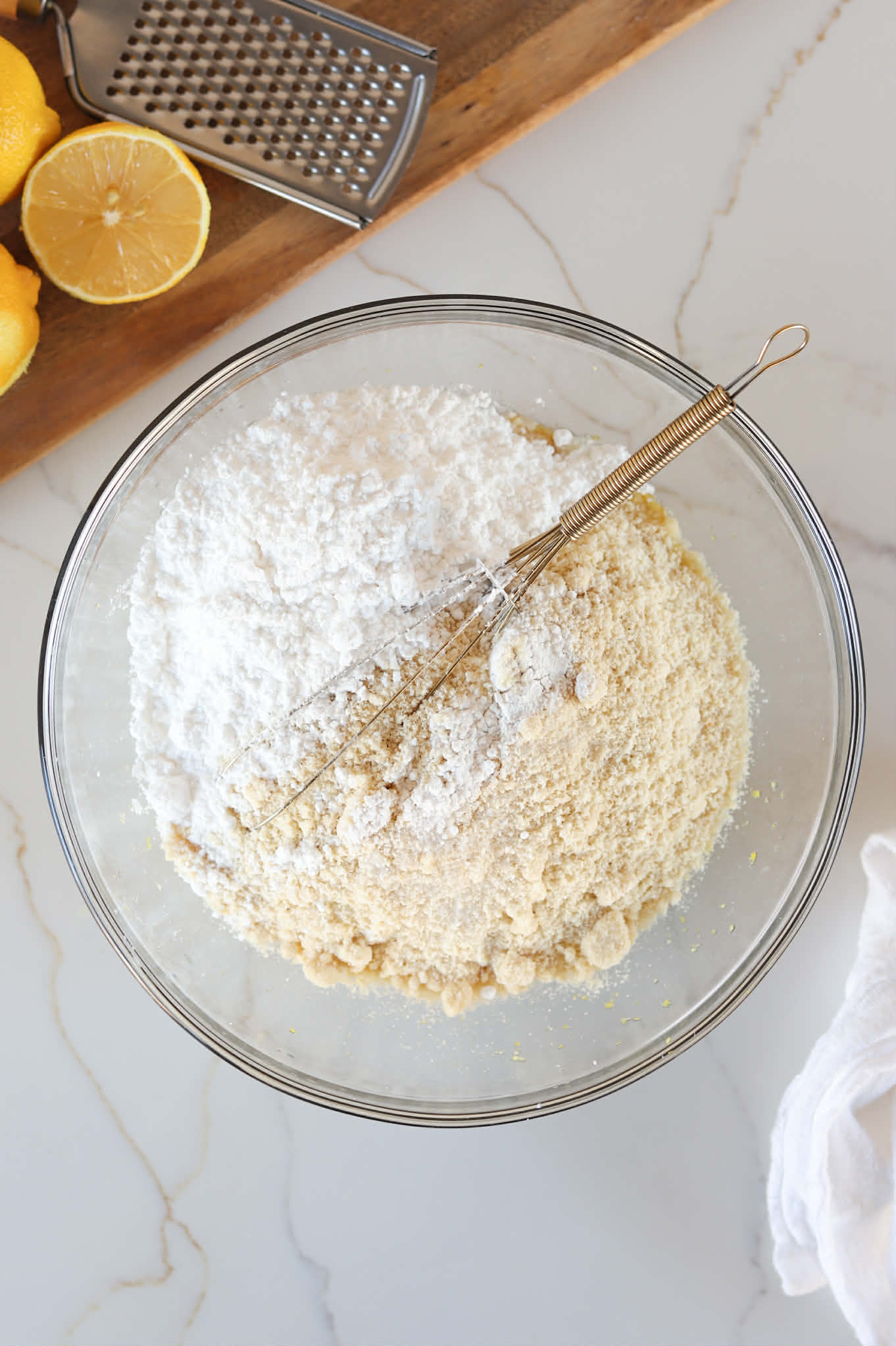 Add 3 cups of almond flour, 1 cup of confectioners sugar, 1/2 teaspoon of baking powder and 1/4 teaspoon of salt and mix until a firm evenly distributed dough forms.
