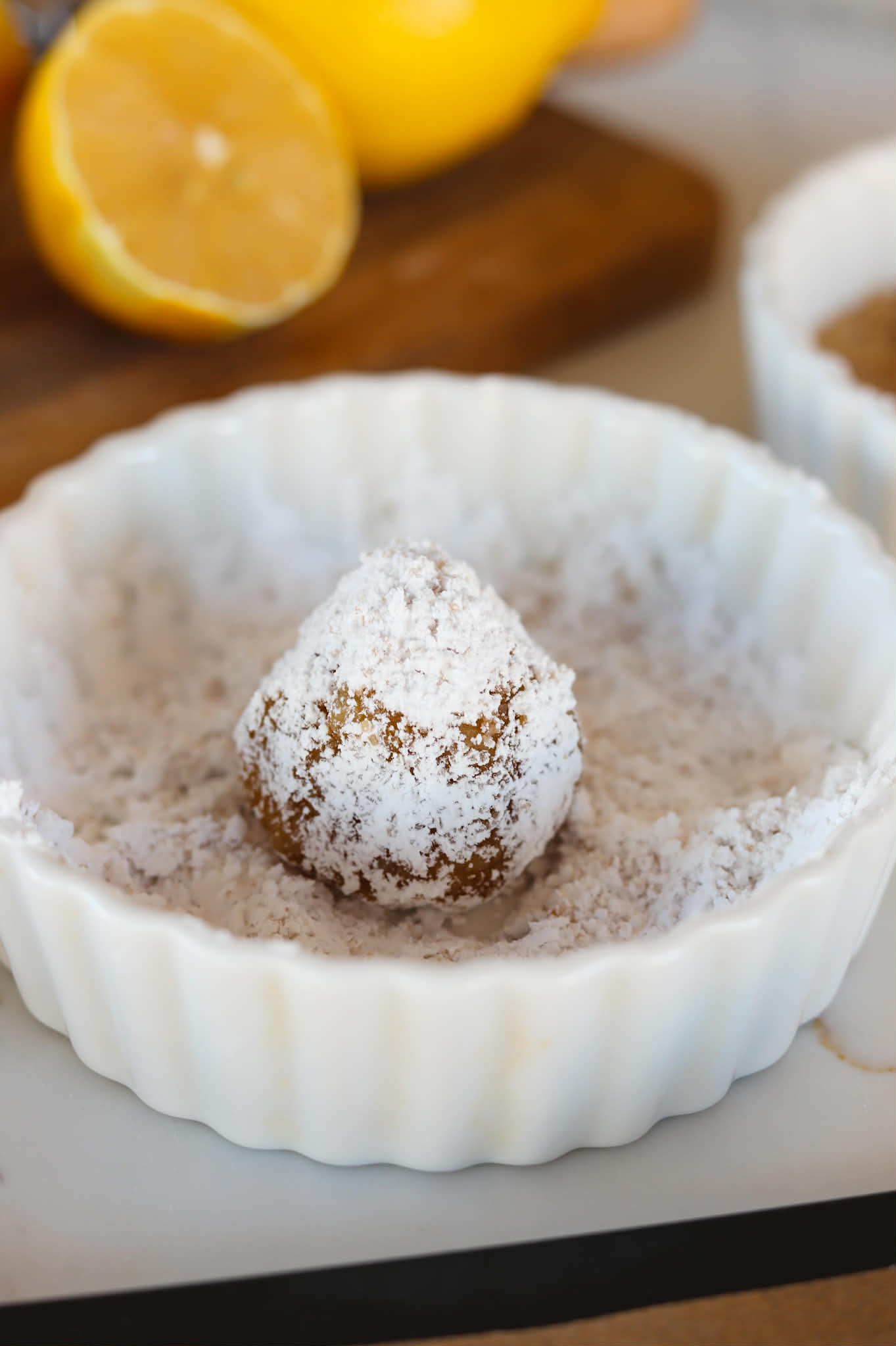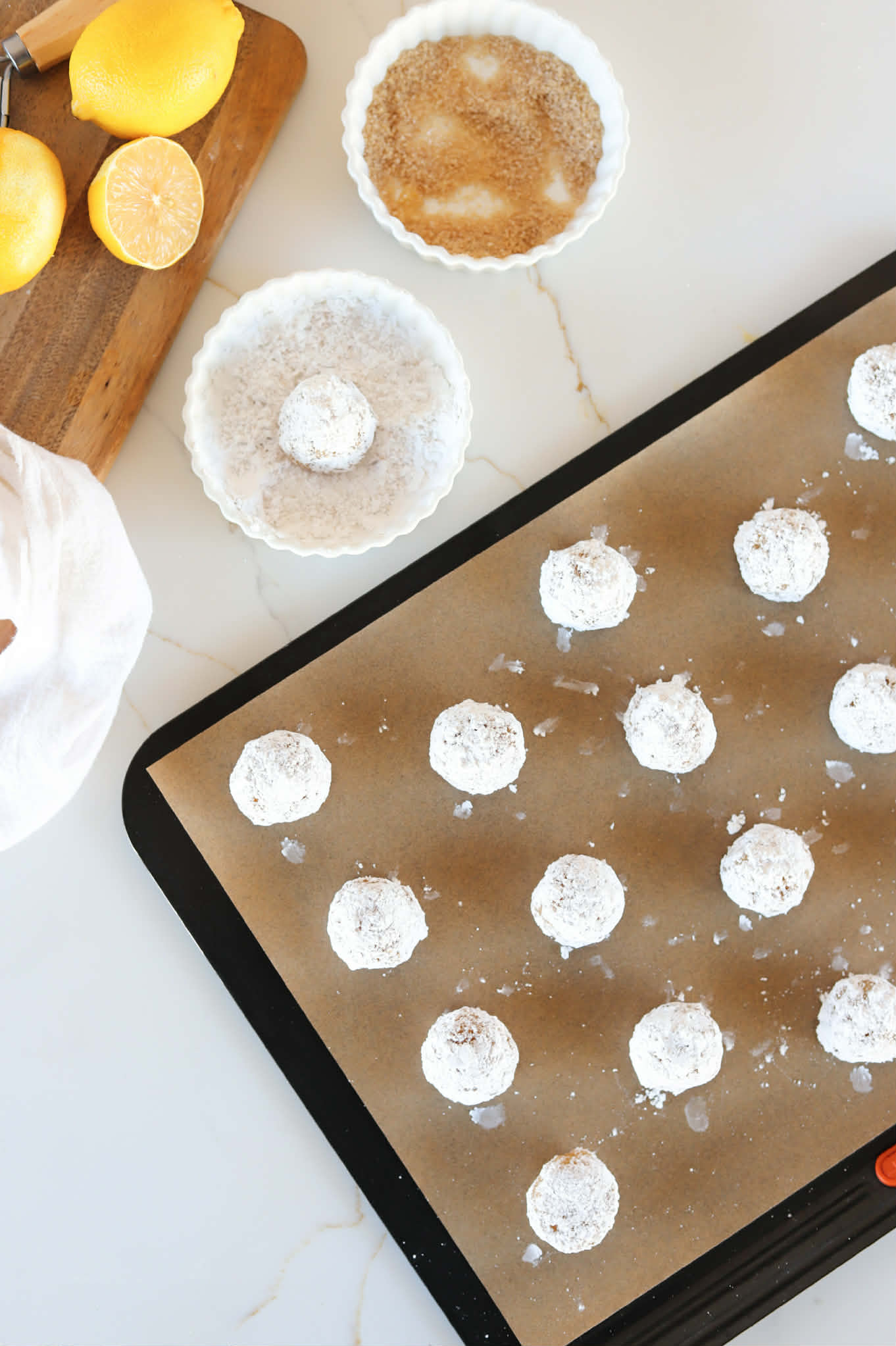 • Roll a tablespoon of dough into a round ball and then roll in the course sugar and then the confectioners sugar