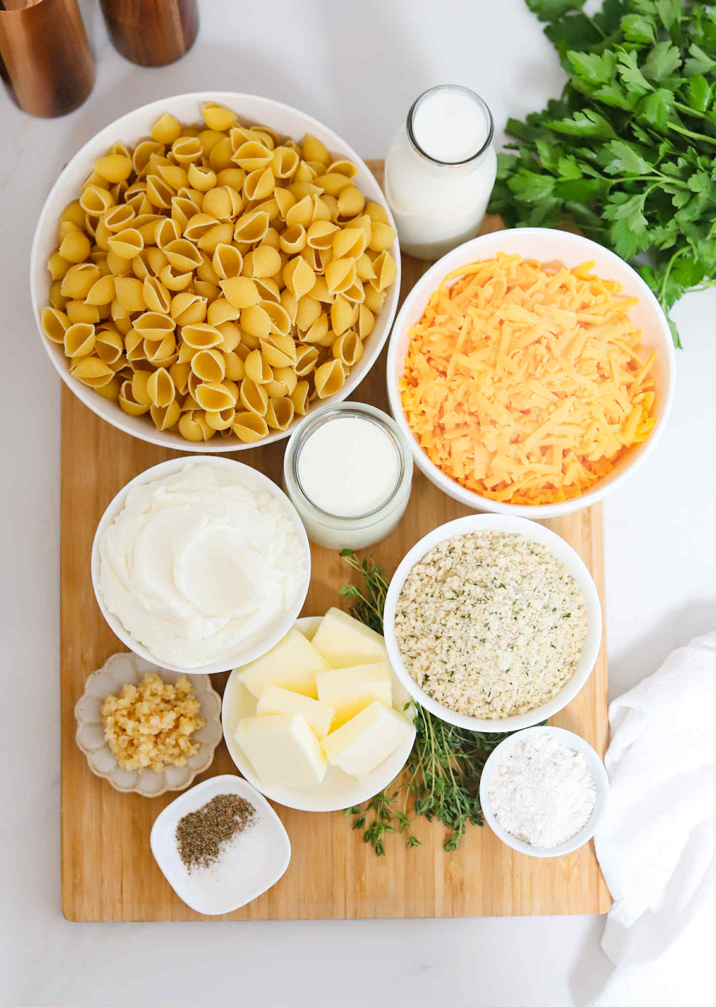 Today, we are making a rich baked mac and cheese with a ricotta and sharp cheddar sauce topped with a buttery garlic herb breadcrumb… and it is just as delicious as it sounds, so whether you are craving the extra creamy version or a thicker, gooey one, I have exactly what you need.