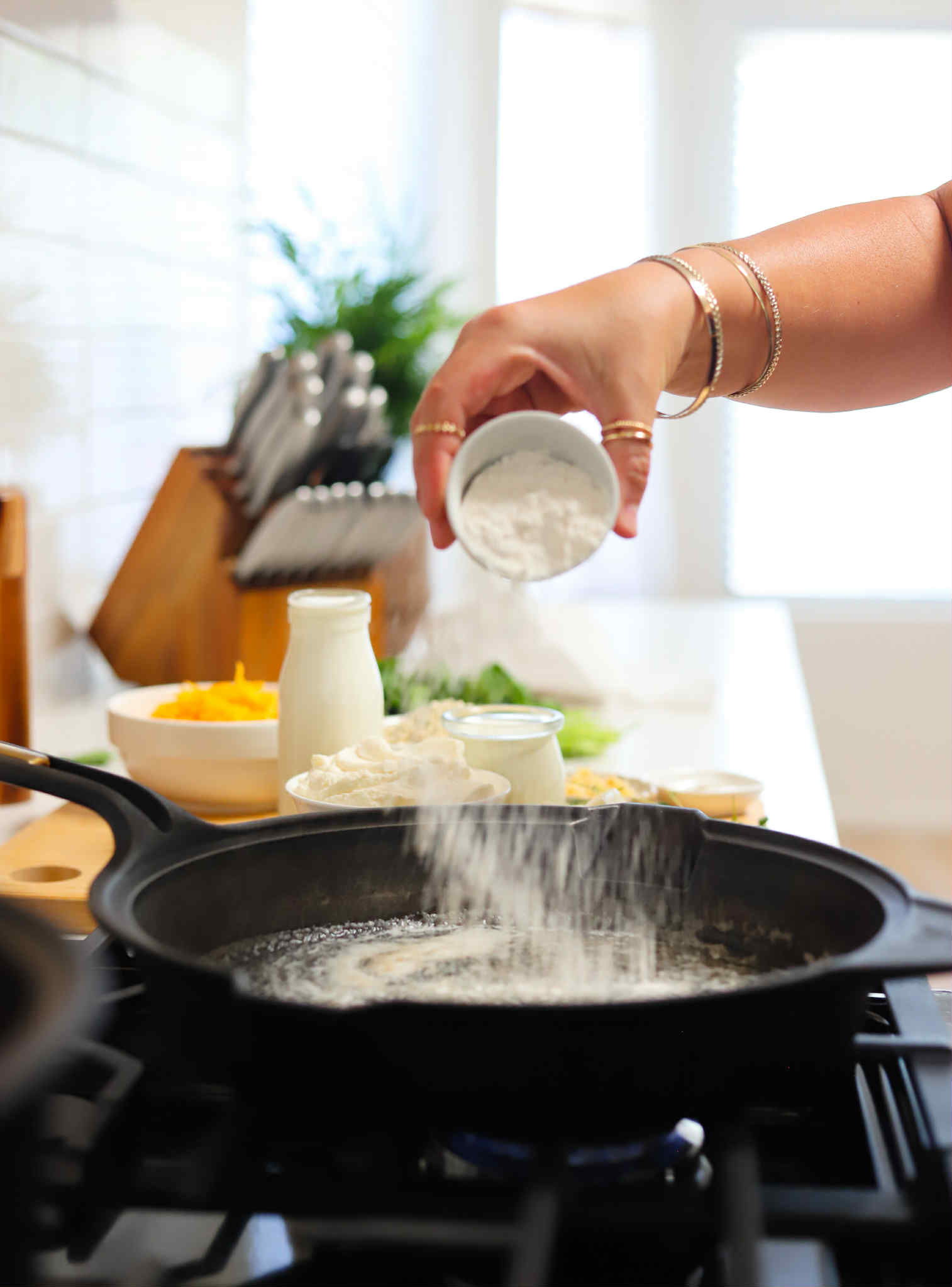 To season your cheese sauce, you will definitely need salt and black pepper, but I also highly recommend Dijon mustard and just a dash of your favorite hot sauce. Trust me, it is a much needed layer of flavor in a fabulous mac and cheese.