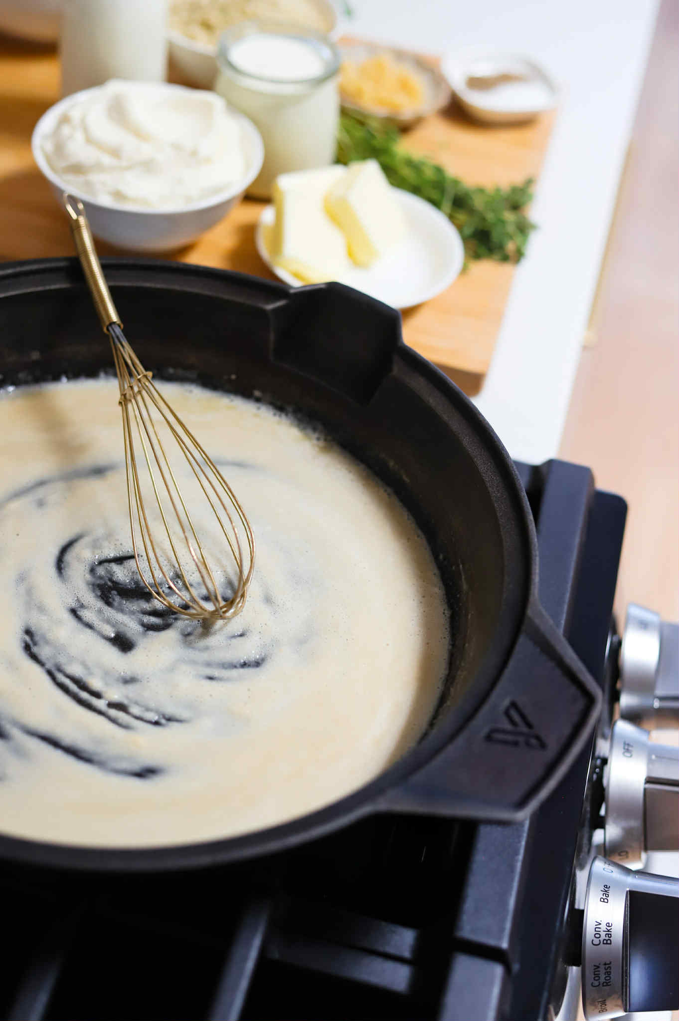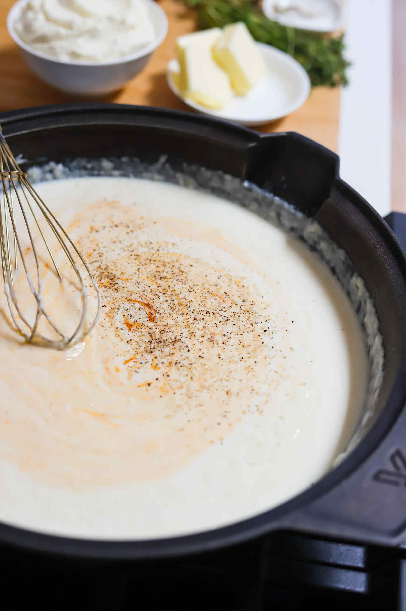 - Whisk in 1 1/2 cups of whole milk and 1 cup of heavy cream and season with a teaspoon of salt, 1/4 teaspoon of black pepper and the optional dijon mustard and hot sauce