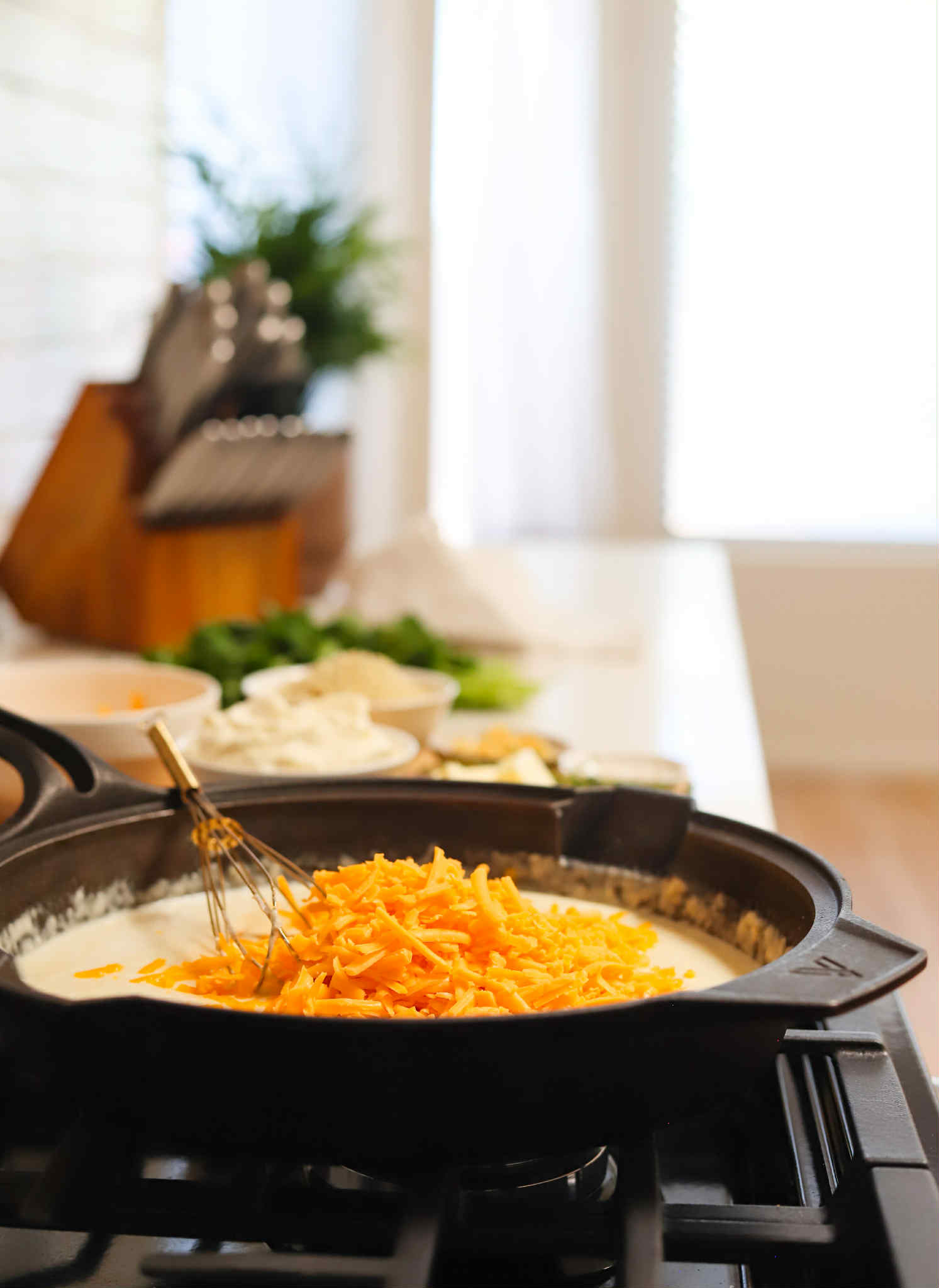 - As soon as it begins to simmer, reduce the heat to low and slowly add the shredded sharp cheddar and 15 ounces of ricotta stirring as you go