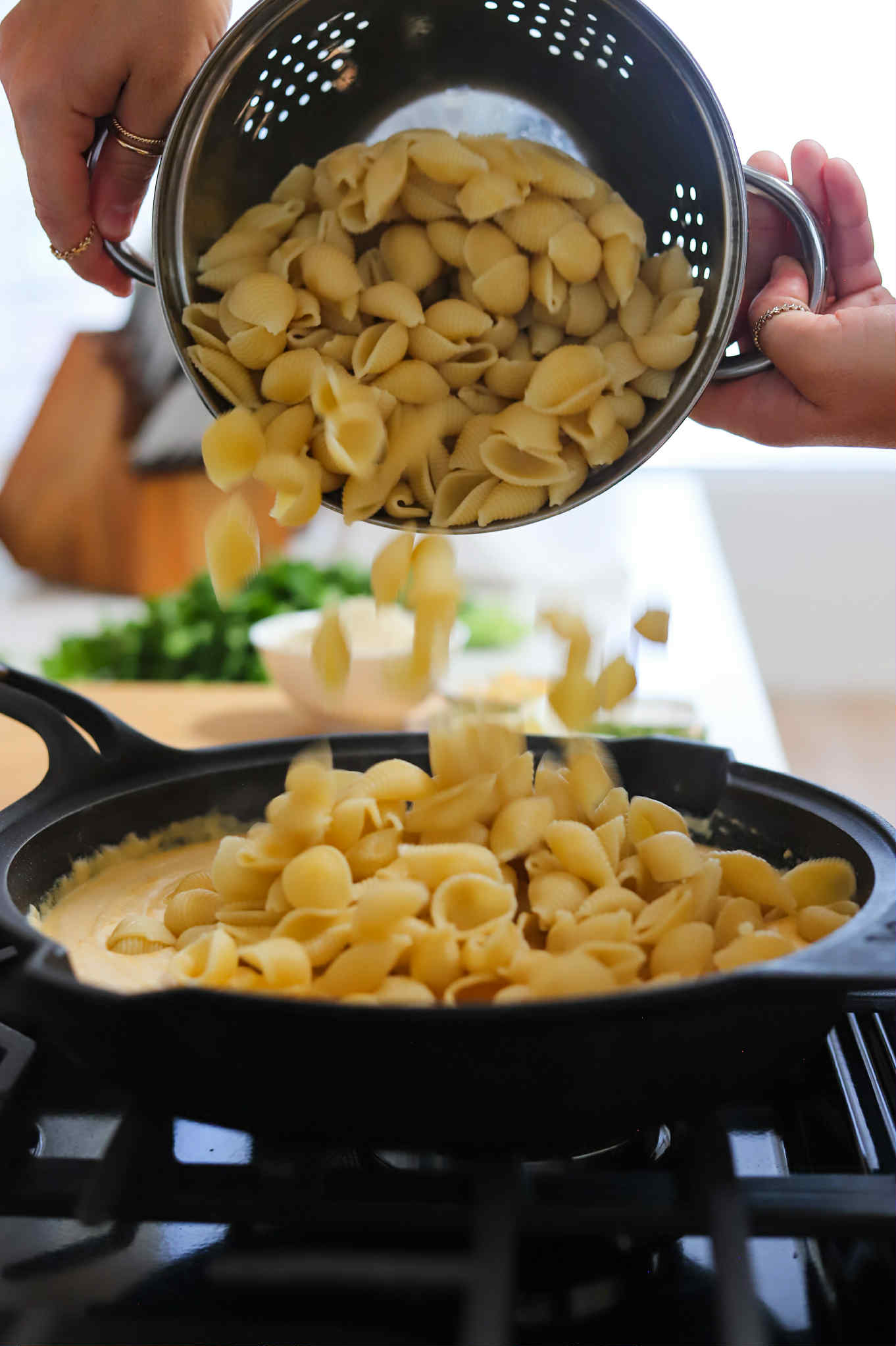 Stir the sauce until all of the cheese has been melted and fully incorporated and then add your cooked and drained pasta. Mix the pasta until everything has been evenly distributed and transfer the skillet off of the heat.