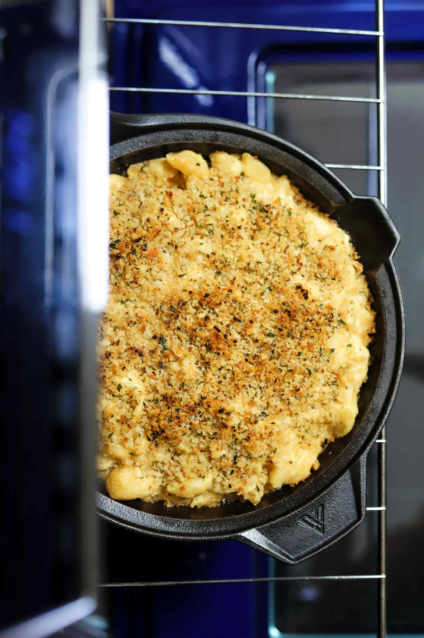 Now bake this mac and cheese until the sauce is bubbly and the breadcrumbs are crisp and lightly golden. This should take about 25-30 minutes, but keep an eye on the color of the breadcrumbs. If your oven has hot spots (and most of them do), you may need to shift the skillet around a little or even pull it out a little earlier if things are getting brown around the 20 minute mark.