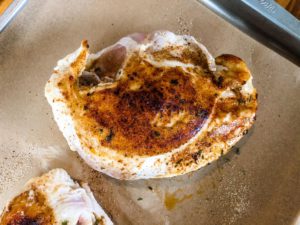 Because we are making a pan gravy with this chicken, we are quickly searing the chicken breasts in a skillet to both create a great crust on the chicken and to give us some brown bits in our future gravy pan.