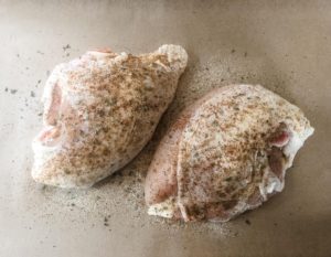 - Pat bone-in skin-on chicken breasts dry with paper towels and season them with garlic powder, onion powder, paprika, chili powder, cumin, black pepper and dried parsley