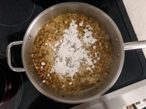 - Once the shallot has started to soften, sprinkle about 1/3 cup of flour into the skillet and cook, stirring consistently, for about 60 seconds