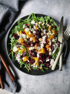 Add a thin layer of baby arugula onto your plates and divide the roasted beets between the plates. Top each salad with crumbled goat cheese, finely chopped walnuts and some pomegranate arils, if you would like a little pop of tanginess in your roasted beet salad.