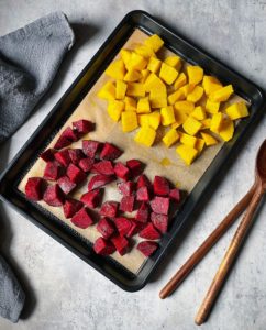 Begin by peeling and slicing 2 bunches of beets into bite sized pieces. Typically, a “bunch” of beets contain 3 large beets or 4 smaller ones. Once they are peeled and sliced, place the beets onto a parchment lined baking sheet. Drizzle the beets with olive oil and season generously with garlic powder, onion powder, salt and black pepper. Roast the beets in a 400 degree oven for 25-30 minutes or until tender.