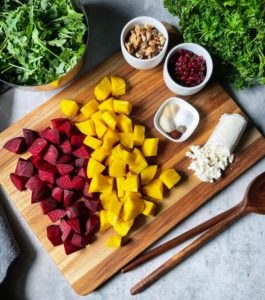 While the beets are roasting, gather about 1 cup of baby arugula, 1/4 cup of finely chopped walnuts and crumble 2 ounces of goat cheese.