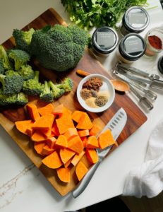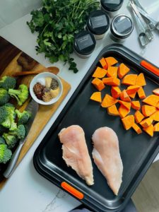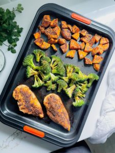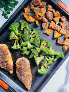 Are you familiar with the many ways that a sheet pan can help you create a simple, healthy dinner even on a busy weeknight? If not, then I would love to introduce you to this roasted broccoli, sweet potato and chicken recipe. It is super easy to bring together and all you need to do is season, roast and enjoy!