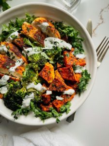Divide the chicken, broccoli and sweet potatoes between 2 bowls and I like to add a little fresh herbs and a drizzle of my favorite cilantro garlic yogurt sauce…