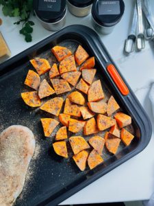Preheat your oven to 415 degrees and place your chicken and sliced sweet potatoes on a large sheet pan. Give everything a drizzle of olive oil and generously season both sides with your seasoning.