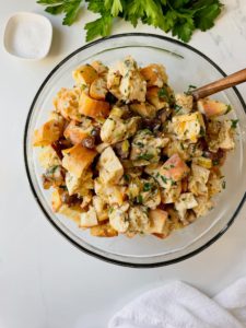 Bake the dressing uncovered at 350 degrees for 40-45 minutes or until the bread is golden brown and the center feels mostly set. I like to give the dish a little shake and if the center of the dressing doesn’t wobble, we are good to pull it out of the oven.