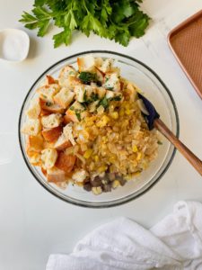 Place a large skillet over medium heat. I like to use the same skillet to prepare the dressing and bake it in, but you can also prep everything in a skillet and transfer it into a baking dish if you prefer.