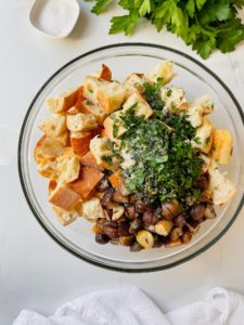 Using larger cubes of crusty bread helps to maintain great texture in certain parts of the dressing, while other areas are soaked in a veggie filled custard. If you scoop just right, you can have a bit of both!