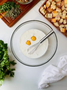 Make sure to scrape every bit of the custard and vegetables out of the bowl and spread the dressing evenly throughout your baking dish. If you see any dry pieces of bread, be sure to press them into the custard a bit, so they don’t dry out as they bake.