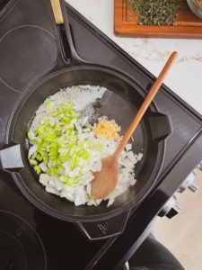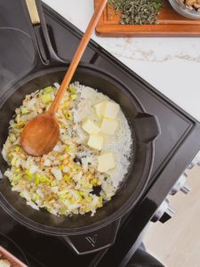 Add 2 tablespoons of butter into the skillet and as soon as it has melted, add the minced garlic, diced yellow onion and celery and cook for about 5 minutes.