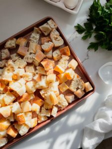 Spread the cubed bread over a large baking sheet and bake it for about 15 minutes in a 350 degree oven to dry it out. You don’t want the bread hard or golden brown, just dry and a little stiff feeling to the touch. This will help the bread soak up the custard as it bakes.
