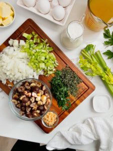 While the bread is drying out in the oven, dice up a large yellow onion and 2 large ribs of celery. Mince 2 cloves of garlic and finely chop some fresh parsley, sage and rosemary. Quarter 5 ounces of roasted chestnuts and gather 2 cups of broth (chicken, turkey or vegetable), 1 1/2 cups of heavy cream, 2 large eggs, 1/2 cup of butter and some salt and black pepper.