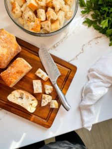 Let’s start with the bread. You can really use any kind of bread in this dressing and some of the texture will be decided on what kind of bread you choose. I am using ciabatta, because I prefer a little more texture in my dressing. You could also use a baguette, focaccia or any crusty rustic loaf you can find at your local bakery.