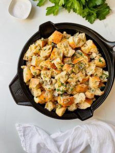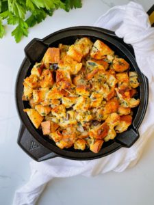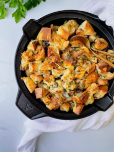Like I mentioned earlier, I love using the same skillet for everything when I am making stuffing. I am using Victoria Cookware’s 12 inch Signature cast iron skillet that is oven safe and also pretty enough to set directly on my holiday table. Minimal clean up is always a good idea.