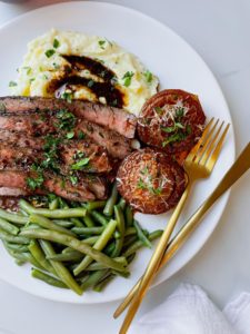 Place 2 cups of beef broth into a large oven safe skillet and bring the broth up to a boil. As soon as the broth is boiling, whisk in 4 tablespoons of butter, 1 tablespoon of soy sauce, 1 tablespoon of tomato paste and 1 teaspoon of worcestershire sauce and turn off the heat.