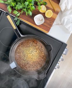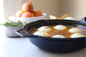 - Place the onions cut side down into an oven safe skillet and set aside for now