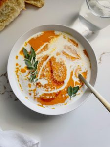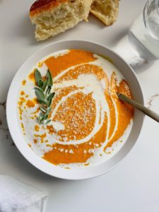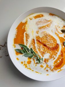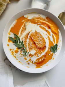 Right before you enjoy this beautiful bisque, add a thin drizzle of heavy cream, a teeny bit more maple syrup if you want to highlight the natural sweetness in this soup and a sprinkle of grated parmesan. Creamy, salty, thick, rich and so very comforting…