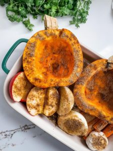- Add the prepared pumpkin, onion, garlic, apple and carrots into a deep baking dish and drizzle with several tablespoons of olive oil