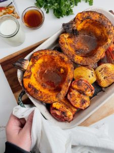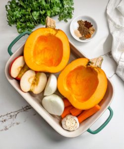 Cut a 3 pound sugar or pie pumpkin in half and remove all of the seeds. Do the same with a large sweet apple (I am using a pink lady, but honey crisp, envy and gala work great too). Peel 2 medium carrots, chop a yellow onions in half and remove the outer layer and then cut the top off of a bulb of garlic. Put everything into a deep baking dish and drizzle with a few tablespoons of olive oil.