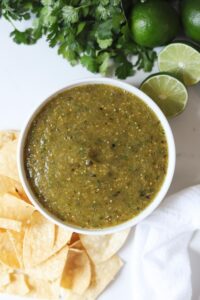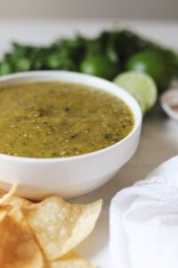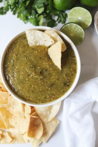 I love having a good salsa recipe on hand. One that is quick to bring together, flavorful enough to be enjoyed with plain tortilla chips and versatile enough to be used in a wide variety of dishes. This roasted salsa verde is all of those things and whether you are whipping it up for friends at game night or making a batch to use in my creamy salsa verde chicken, you are going to love this salsa.