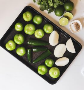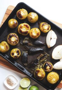 - Place the tomatillos, jalapeños and onion on a baking sheet and roast for 12-15 minutes flipping half way through