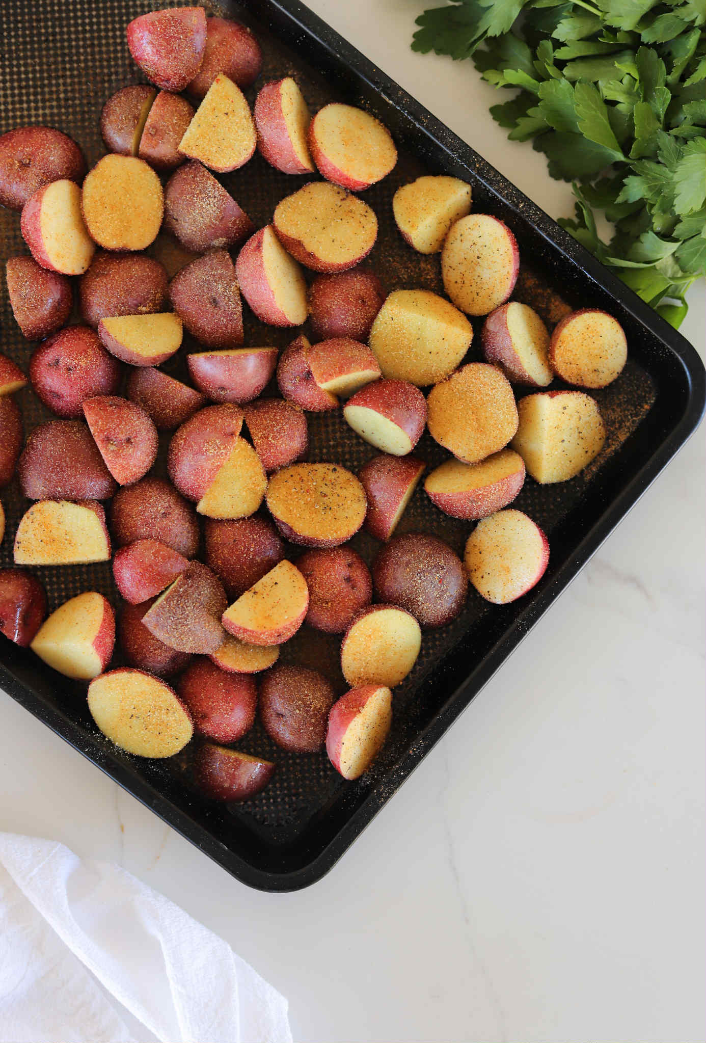 - Place the halved potatoes onto a rimmed baking sheet, drizzle with olive oil and season generously with garlic powder, onion powder and seasoned salt