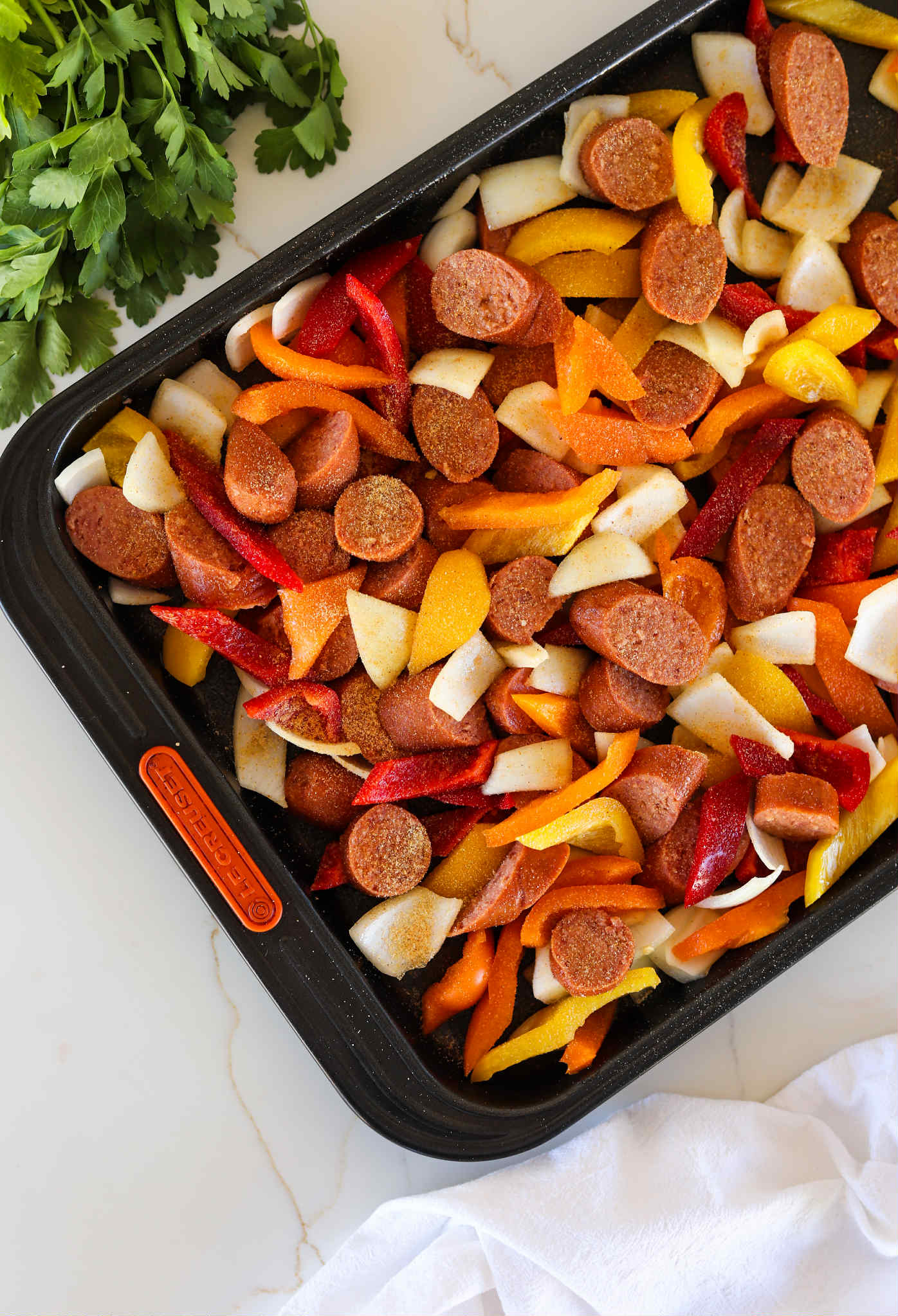 - Place the thick sliced peppers, onions and smoked sausage onto a rimmed baking sheet, drizzle with olive oil and season generously with garlic powder, onion powder and seasoned salt