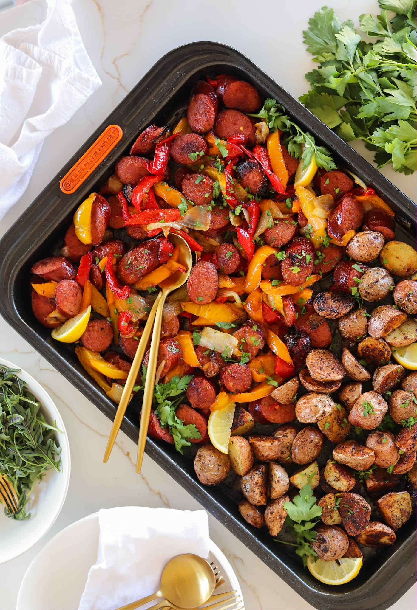 Add your second baking sheet and roast for another 20-30 minutes or until the potatoes are tender and the sausage and peppers are lightly caramelized.