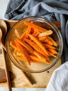 Even with roasting the sweet potatoes, this salad will come together in less than 30 minutes. Start by peeling and thinly wedging a medium sweet potato. Place the wedges into a large bowl and add a splash of olive oil, 1 teaspoon of the seasoning of your choice and toss until all of the sweet potatoes are coated.