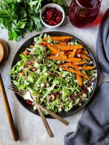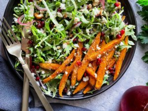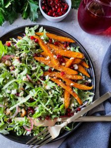 In addition to the wonderful flavors and textures, this salad is also full of healthy ingredients. The sweet potatoes are a great source of fiber, the red onions contain antibacterial properties and pomegranates are an amazing superfood that are full of antioxidants and flavonoids that are shown to fight cancer and improve gut health.