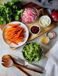 Now that the sweet potatoes are roasting and the red onions are pickling, gather some baby arugula, pomegranate arils, crumble some goat cheese and grab your favorite dressing.