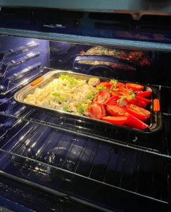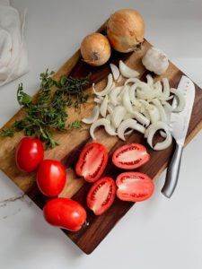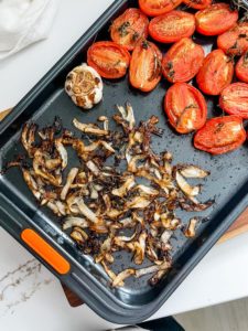 - Roast the tomatoes, onions and garlic for 45 minutes (flip the onions several times to ensure even caramelization)