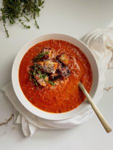 This roasted tomato garlic and herb soup is absolutely delicious. There is so many beautiful flavors going on here. Roasting vegetables brings the best out of them and the delicious flavors in this soup is proof that you do not need to stand over the stove for hours in order to develop rich, comforting layers of flavor.
