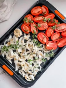 - Place the halved tomatoes, sliced onions and garlic bulb (cut side up) on a large baking sheet