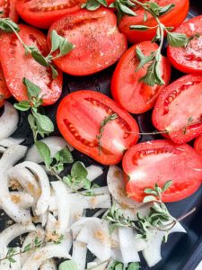 Begin by slicing 2 pounds or 8 large roma tomatoes in half and slice up 2 medium yellow onions. Slice the top off of a bulb of garlic to expose the tops of each clove and separate a few sprigs of fresh thyme and oregano.