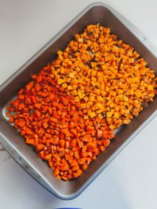 Preheat your oven to 400 degrees and peel and dice your carrots and sweet potatoes. Although they will be soft after roasting, be sure to dice the carrots and sweet potatoes into easily bite sized pieces. Place them into a deep roasting pan and place them into the oven.