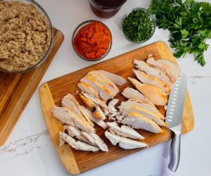 Transfer the roasting pans onto heat proof surfaces and allow the carrots, sweet potatoes and chicken to come to room temperature while you prepare the remaining ingredients.