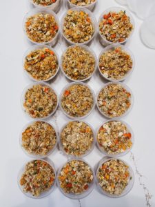 Once the food is made and mixed thoroughly, it is time to divide it up for storage. I used to add 2 cup portions into zip lock bags, but that was messy and the bags are tough to re-use, so I ordered dishwasher safe to-go food containers off of Amazon and love how easy this system is. You can write the date on the lid and it washes off in the dishwasher, so they are ready to go for the next batch!