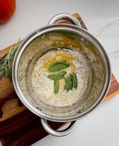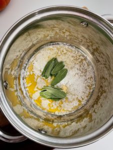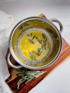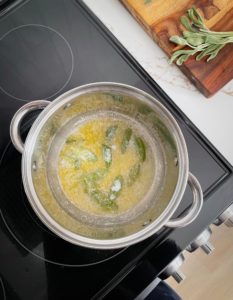 - When the butter has melted and begins to get frothy, add the sage leaves and allow the butter to foam and bubble until it begins to brown slightly and crisp the sage leaves