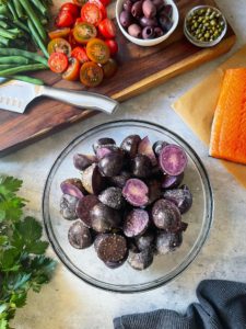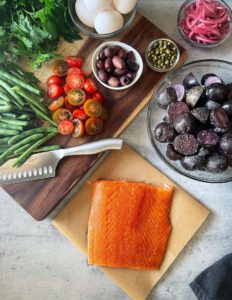 Begin by gathering 8 ounces of salmon or tuna, 4 large eggs, 8 ounces of baby purple potatoes, 5 ounces of heirloom tomatoes, 1/3 cup of pickled red onions, 1/3 pound of fresh green beans, 4 ounces of niçoise olives (or kalamata olives), 2 tablespoons of capers and 2 cups of baby arugula.